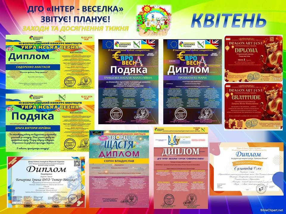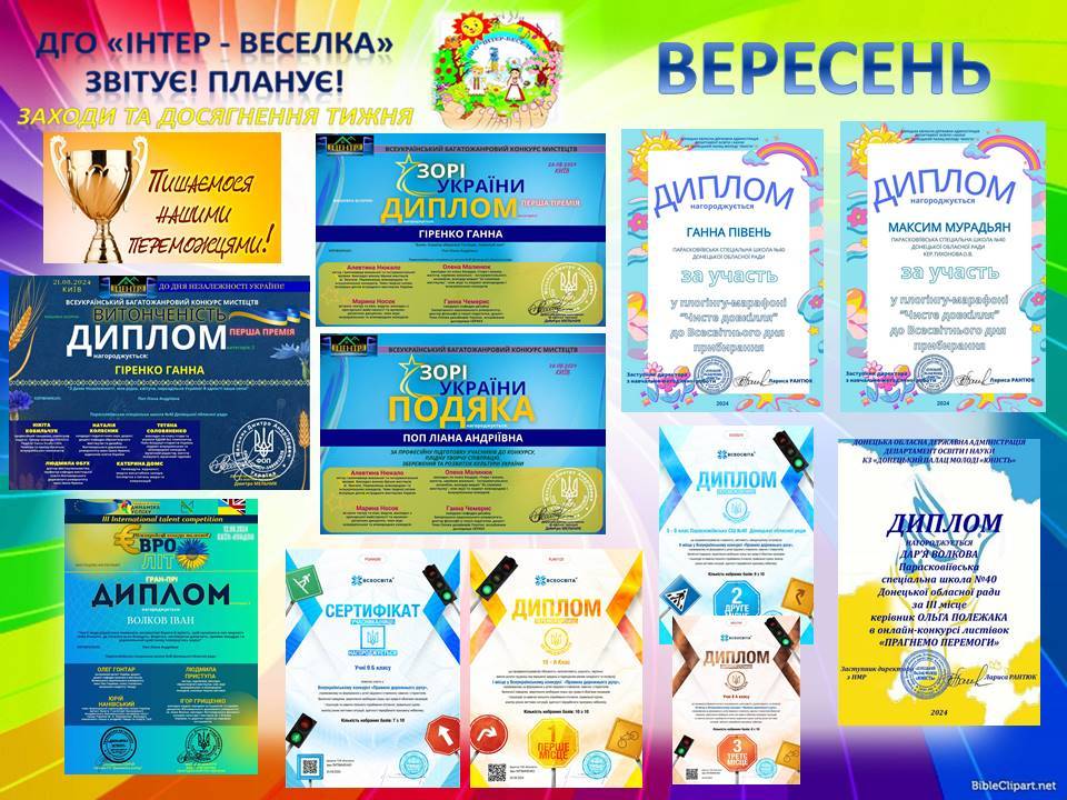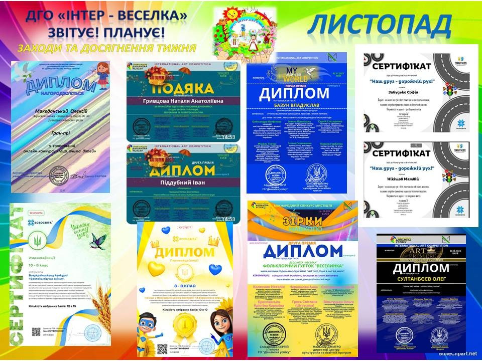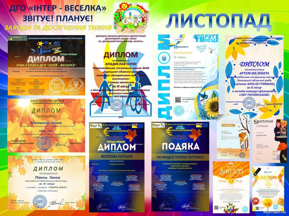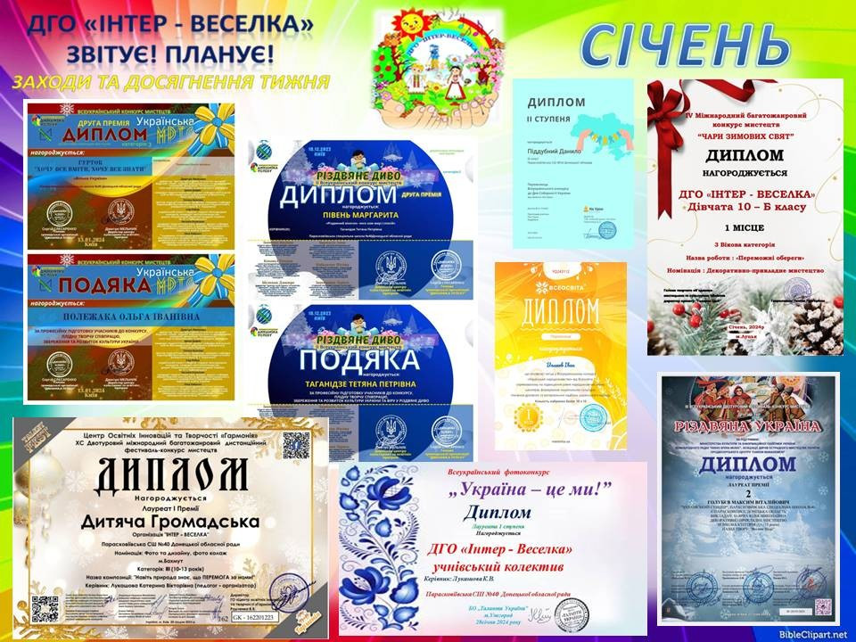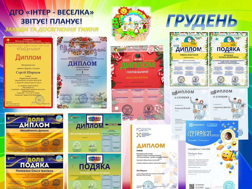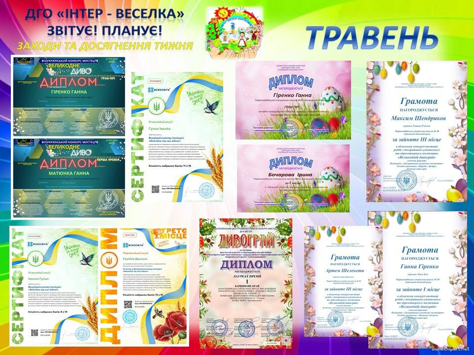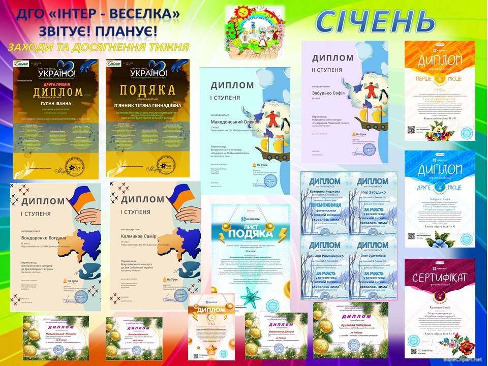 Шкільна родина ДГО 🌈Інтер-Веселка🌈 Парасковіївської СШ №40 активна, творча, талановита! Ми далеко один від одного на щастя - ми працюємо діти навчаються, творчо розвиваються! Приймаємо активну участь у обласних заходах, акціях, флешмобах та конкурсах! Результати наших старань оцінено ДИПЛОМИ! 👏 Отримано 41 ДИПЛОМ! Гран при! І МІСЦЕ! ІІ МІСЦЕ ! ІІІ МІСЦЕ та за УЧАСТЬ у Обласному конкурсі "Ялинкова прикраса! 🌟🌲
