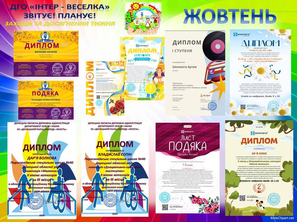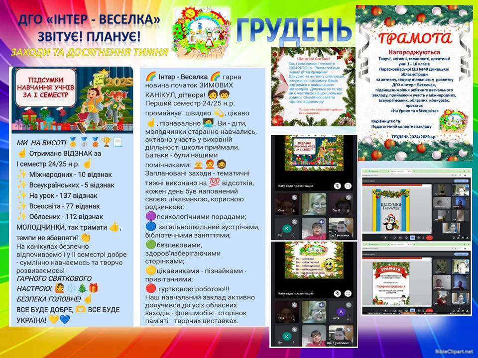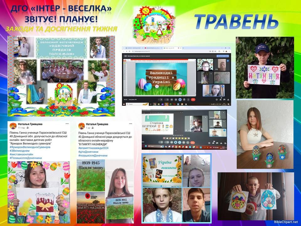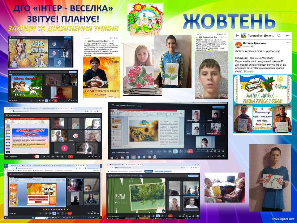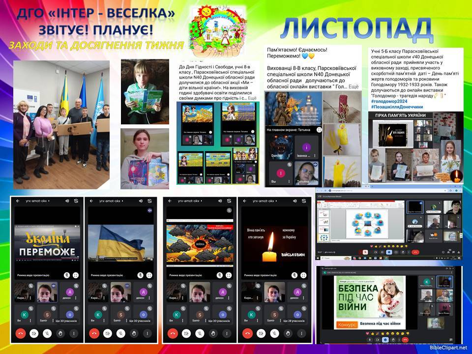 Тиждень у Парасковіївській СШ№40 Донецької обласної ради був насичений не лише знаннями, виховною діяльністю, а й піклуванням про ментальне здоров'я, було реалізовано короткостроковий проєкт "Інтер - Веселка ти і я разом ми шкільна сім'я!" Було цікаво, корисно, пізнавально! Проведено онлайн зустрічі "У світі емоцій", створено галерею світлин "Скарбничка радості", працювала онлайн - майстерня "Веселка щастя"!