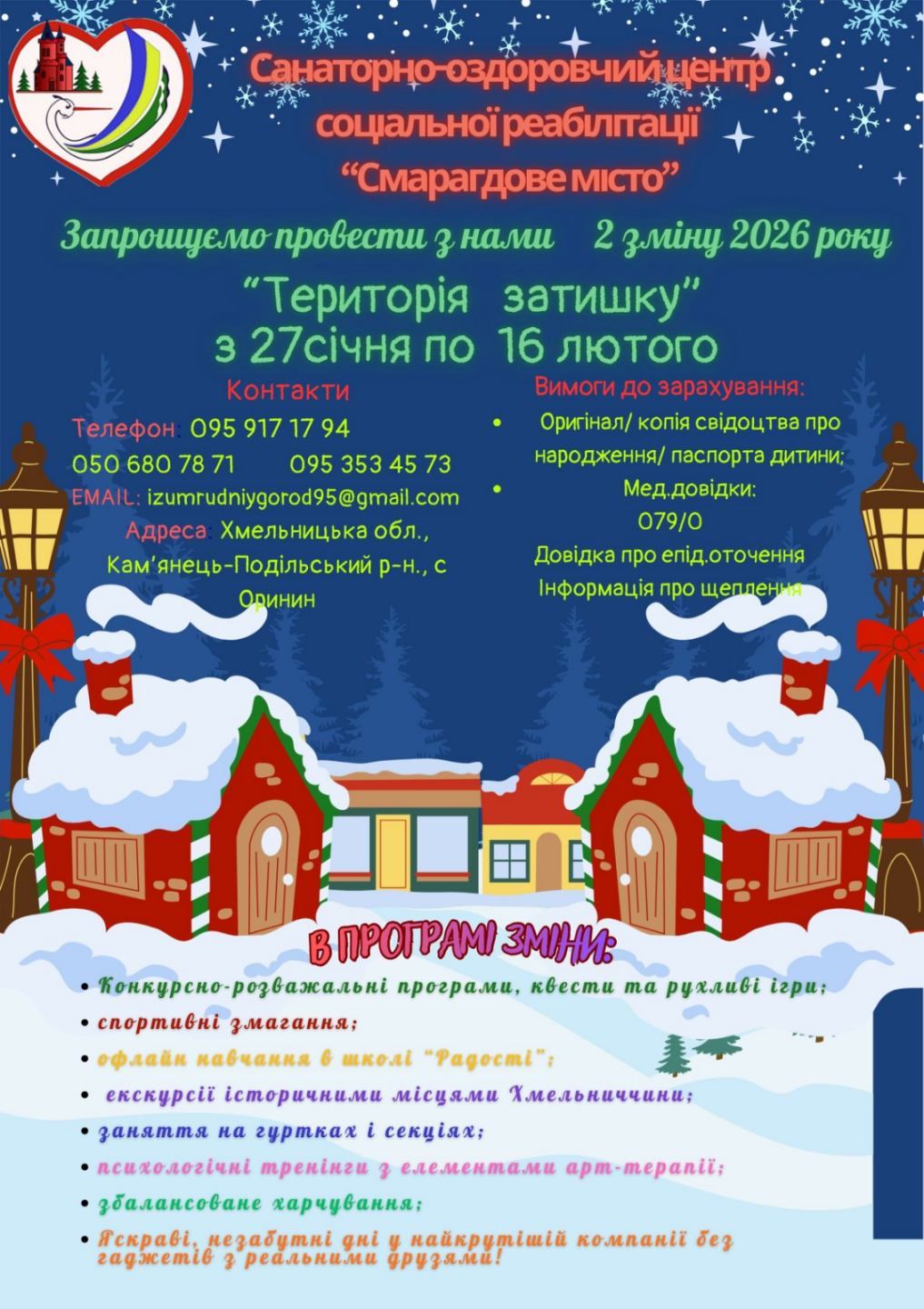 Запрошуються на безпечне офлайн навчання, відпочинок та соціальну реабілітацію до СОЦ СР "Смарагдове місто" (с. Оринин, Кам'янець - Подільського району, Хмельницької області) діти віком від 6 до 16 років на II тематичну зміну Територія затишку" з 27 січня по 16 лютого 2026 року.