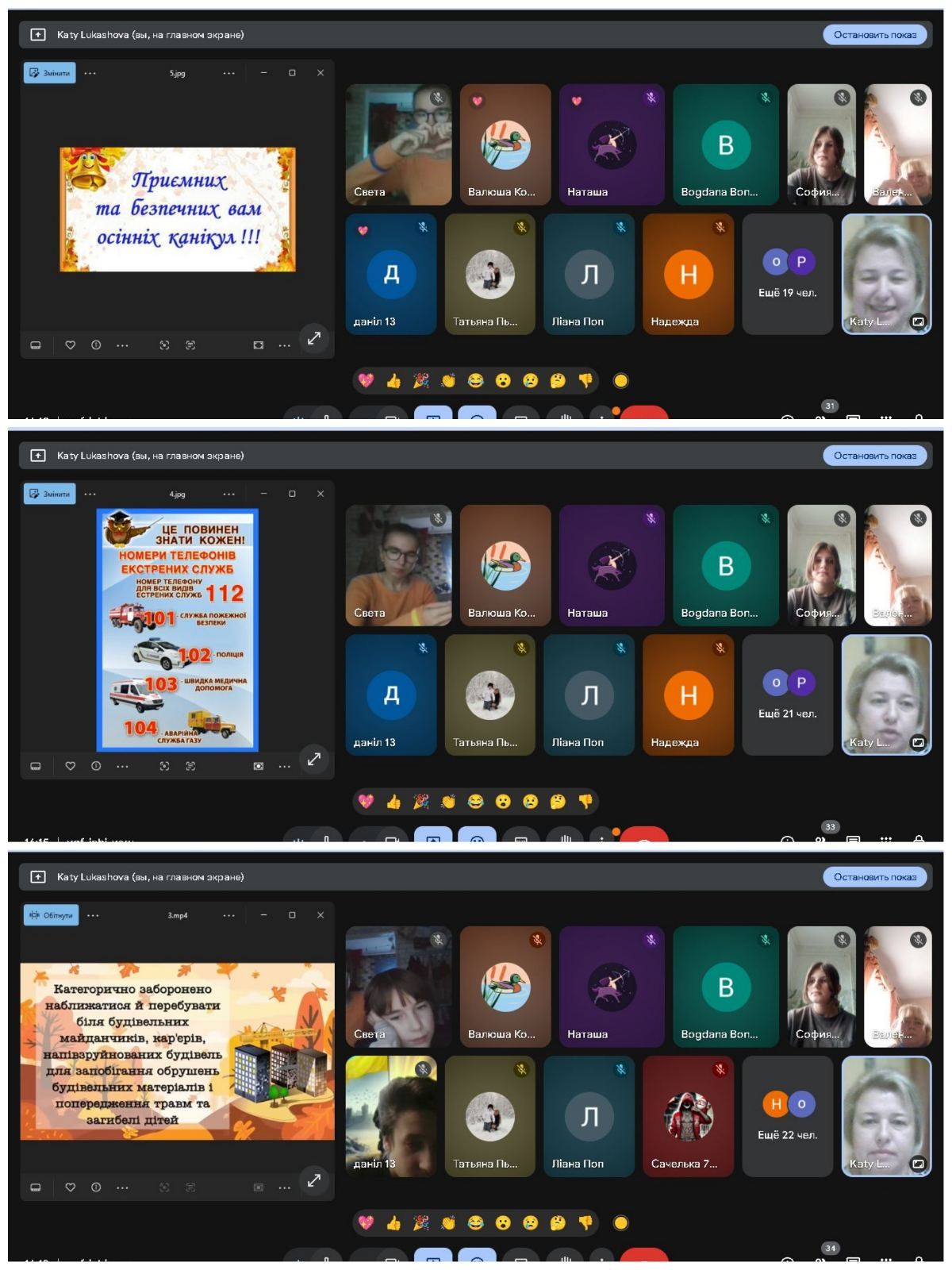 На передодні 🍁 осінніх канікул 🙋🏻♀️ у Парасковіївській СШ№40 Донецької обласної ради було проведено онлайн безпековий захід під гаслом "Наші безпечні осінні канікули" 🚓🚑🚒. Осінні канікули 🍁 - чудова пора для відпочинку, зустрічей, прогулянки на свіжому повітрі, але разом із приємним відпочинком є й певні ризики! ☝️ Саме тому ми сьогодні згадали правила безпеки життєдіяльності.